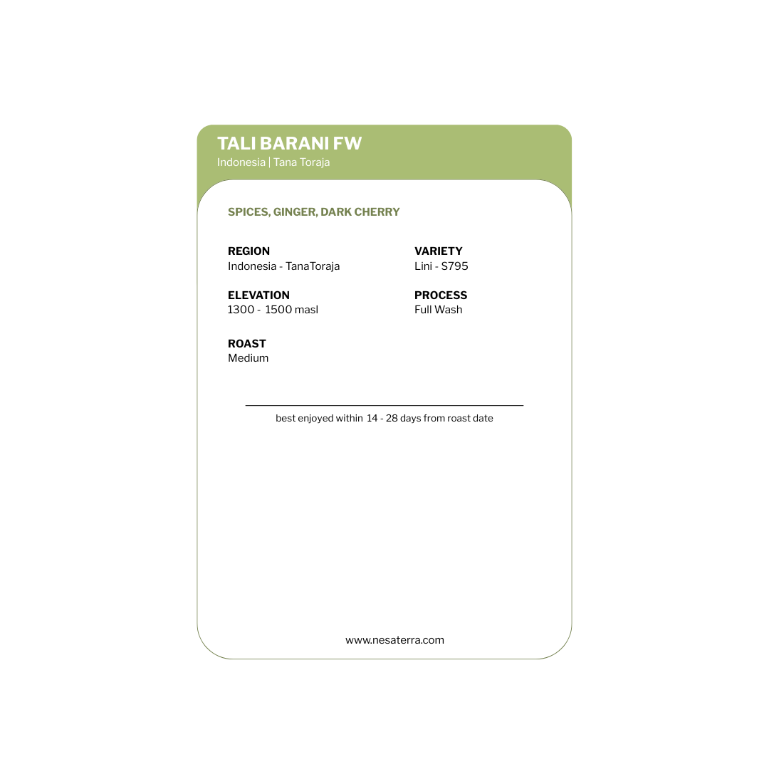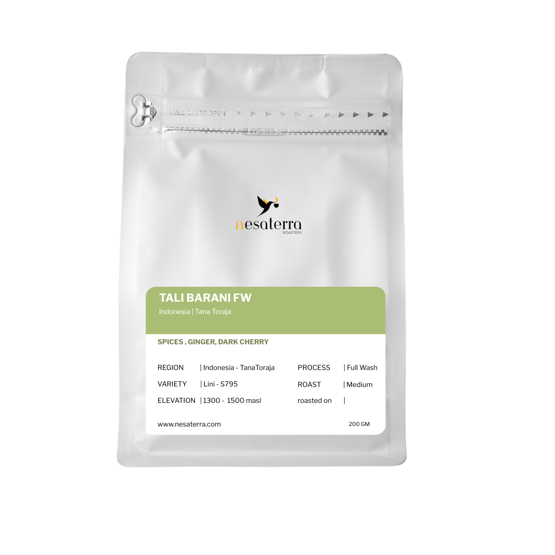 Tali Barani beans offers a distinct flavor profile, shaped by the region’s volcanic soil, high altitude of 1300 to 1500 masl, and unique microclimate. The beans typically exhibit a rich, full-bodied taste with low acidity, featuring prominent notes of dark chocolate and complemented by hints of spice, such as cinnamon or clove, and a subtle fruitiness reminiscent of dried figs or red berries.