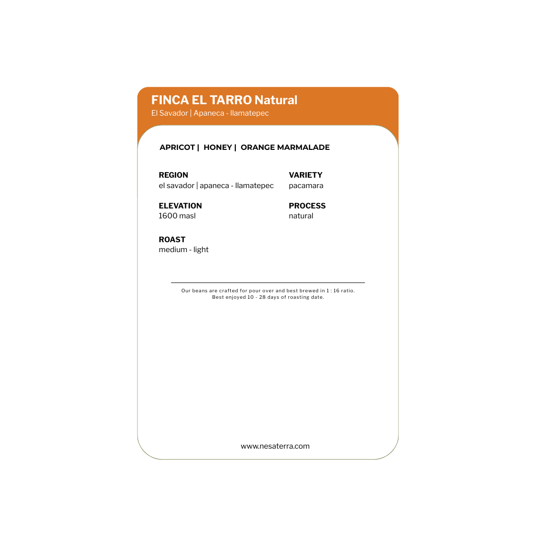 El Salvador is celebrated for coffees with distinctive flavor and aroma, and Finca El Tarro is no exception. Nestled at 1,400 MASL near the village of Ataco, this small farm is part of a region renowned for producing exceptional Pacamara—coffees known for their sweetness and balance. The farm’s name, El Tarro (“The Jar”), was inspired by the honey-like sweetness of its fruit, reminiscent of the honey once collected and stored in jars.
